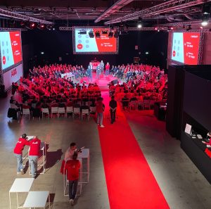 Il progetto si articola visivamente rispettando l’identità dell’azienda mediante la quale è stata creata una corporate evento applicata su tutti i supporti di comunicazione (badge, rollup, pannelli, menu, segnaletiche, giochi interattivi per gli accreditati, ecc.).
