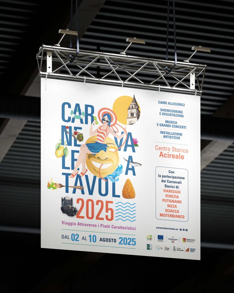 Art Direction e comunicazione visiva per “Carnevale a Tavola – Acireale 2025”, progetto enogastronomico legato al Carnevale di Acireale, che si sviluppa in tre momenti dell’anno valorizzando la tradizione culinaria locale e il legame con il territorio.